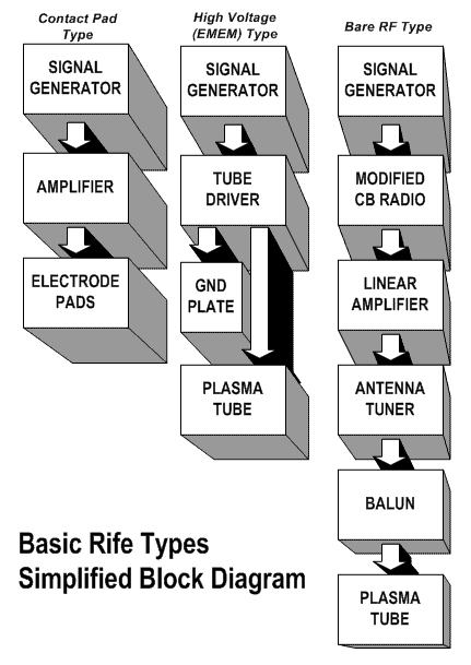 All devices sold or mentioned as Rife devices typically fall into one of three general categories. This of course, varies from design to design, and of course there may be hybrids… but typically this diagram represents the functional components and relationships. In the course of this text, we will attempt to explain in detail at least a portion of those components and relationships.