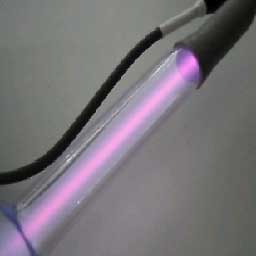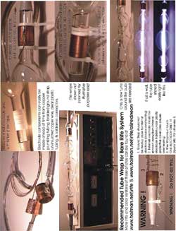 Shown here is a Triple Bubble Bare-Rife tube being “reconditioned” by activating/heating the internal getters to absorb any impurities which have leached through the glass to contaminate the internal gas.