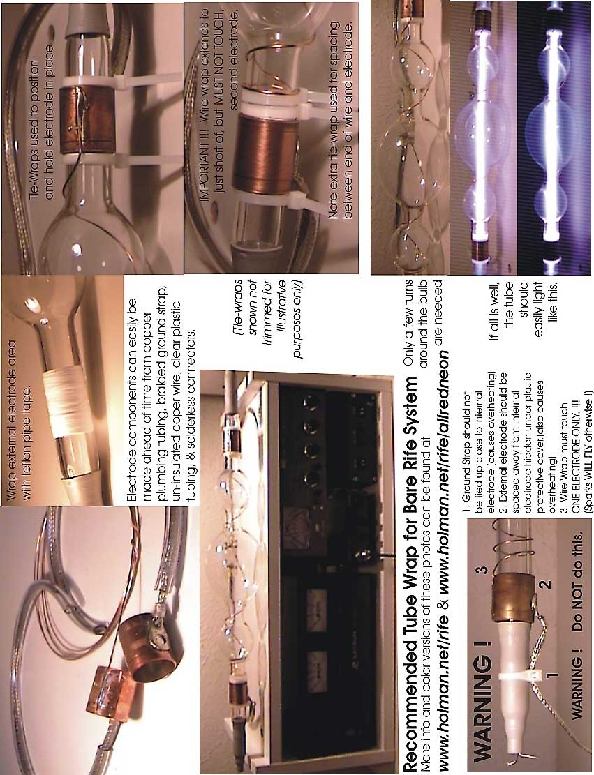 Multi-stranded metallic high voltage wiring is absolutely necessary for a safe and reliable system. Standard high voltage wiring available at most neon sign shops (usually available form the same place you get the tubes) is great. Solid conductor, (not carbon filament), automotive ignition wire may be a useable alternative.
